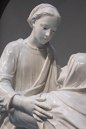 Realizzata intorno al 1445 per la chiesa di San Giovanni Fuorcivitas – dove è collocata abitualmente e dove tornerà al termine dell’esposizione – la Visitazione è una delle prime opere in terracotta invetriata, tecnica di cui della Robbia è considerato l’inventore. L’artista fiorentino per primo applicò alla scultura in terracotta una copertura in smalto stannifero che rendeva la superficie lucida e resistente, iniziando una produzione di grande successo. Il gruppo raffigura l’incontro tra Maria e la cugina Elisabetta, come è narrato nel Vangelo di Luca.