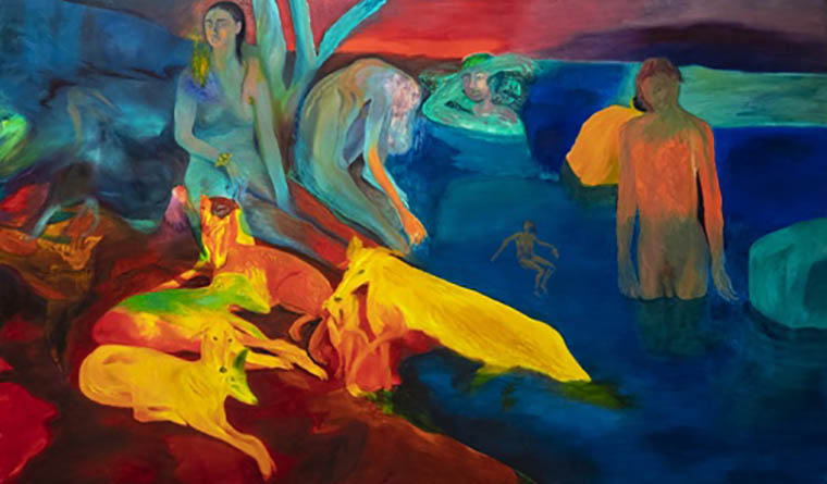 I dipinti dell’artista toscana ci invitano a riconsiderare la potenza narrativa della pittura: attratti da una ricerca sul colore nella sua versione magico-espressiva, seguiamo un flusso di apparizioni figurative, uomini, donne, fanciulli, cani, volatili, animali selvatici, che vivono in un mondo naturale, rigoglioso di piante e di acqua, spazzato via da una tempesta, a volte oscuro come in una plumbea notte.
