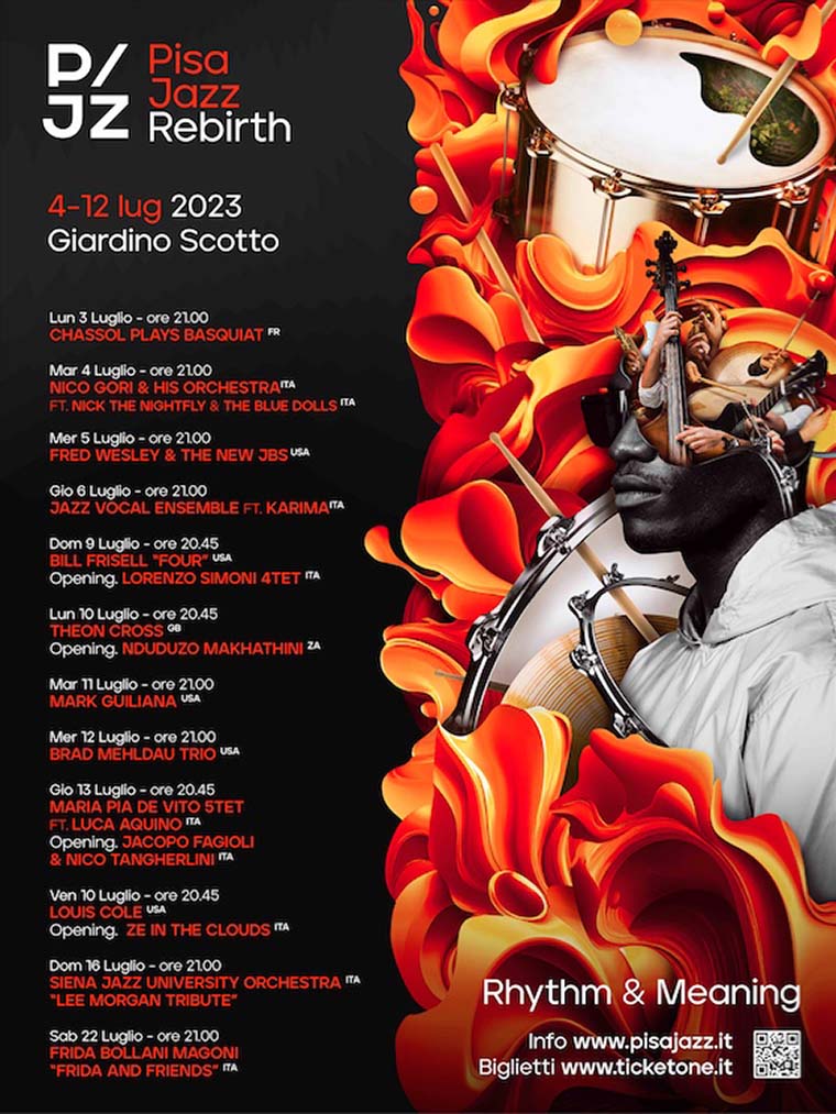 Tra gli appuntamenti da non perdere quello con la stella assoluta del piano jazz Brad Mehldau nella sua formazione più nota e amata, in trio con Larry Grenadier e Jeff Ballard (12 luglio). E poi in prima italiana la presentazione di “Four”, nuovo disco di Bill Frisell, uno dei chitarristi e compositori più rappresentativi della sua generazione, edito dalla prestigiosa Blue Note Records, con Greg Tardy, Gerald Clayton e Johnathan Blake (9 luglio); Louis Cole, rivoluzionario polistrumentista americano, già collaboratore di Flying Lotus, Thundercat e dello stesso Mehldau, con il suo esplosivo progetto in trio (14 luglio); Fred Wesley, leggendario trombonista americano che ha fatto la storia del funk, nel tour di celebrazione dei 50 anni della band che ha accompagnato James Brown per gran parte della sua carriera – The New JB’s (5 luglio); Mark Guiliana uno dei maggiori batteristi al mondo, che presenterà l’ultimissimo album “The Sound of Listening” (11 luglio); Theon Cross innovatore della tuba, già al fianco di Shabaka Hutchings nei Sons of Kemet (10 luglio); Nduduzo Makhathini, spirituale e geniale pianista, primo artista sudafricano ad entrare nella scuderia Blue Note (10 luglio); Christophe Chassol con il nuovissimo progetto dedicato a Jean-Michel Basquiat, debuttato in aprile alla Philarmonie di Parigi e ospite a Pisa nella prima e unica data italiana (3 luglio).