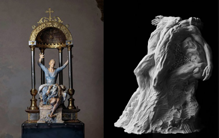 Con la curatela di Antonio Natali (già Direttore della Galleria degli Uffizi), Ugo Riva propone a Volterra quattro opere in terracotta, la prima delle quali – dal titolo Solitudine – è stata realizzata durante i mesi terribili del primo lockdown. In essa le diverse figure poste circolarmente su una base di terracotta scura appaiono nell’atto di fuggire o disperarsi e non mancano simbologie e richiami a capisaldi della pittura rinascimentale fiorentina. «Sono innamorato da sempre di Rosso Fiorentino – dice l’Artista – a tal punto che già nel 1994 gli avevo dedicato una piccola scultura intitolata Le inquetudini del Rosso, dove risaltavo i cambiamenti rivoluzionari nell’arte di cui lui era stato protagonista. Poi rifeci quella scultura, un po’ più grande, nel 2010 per il “Four Seasons” di Firenze, dove tuttora si trova. Arriviamo così a questo progetto, pensato per essere mostrato sul pozzo del Chiostro di Palazzo Minucci Solaini e realizzato in terracotta, di cui in Toscana c’è una grande scuola, un materiale che mi dà un immenso piacere. Rispetto al progetto iniziale, alla fine si è rivelato un lavoro di ‘sottrazione’: ho eliminato la croce, che mi pareva anche banale, e le figure appaiono tutte come se fuggissero da un qualcosa di terribile. Ma perché? Perché in mezzo c’è stato il Covid. Io ho passato un anno da solo in studio, con i miei amici più cari che perdevo uno ad uno a causa della malattia, vivendo una solitudine tremenda, perché nel momento del dolore ognuno è solo con se stesso. Da cui il titolo dell’opera. Infatti nell’opera le figure non si toccano, il pianodi appoggio è pieno di squarci e ferite e perfino la Madonna ha le braccia alzate. Non c’è alcun gesto di condivisione».