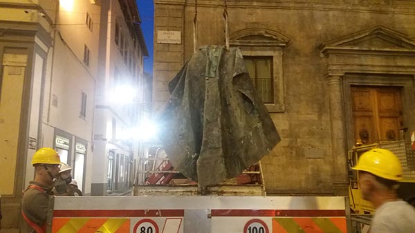 Nella serata dell’11 luglio è stata effettuata la rimozione del mantello bronzeo della statua della Giustizia in Piazza Santa Trinita, opera attualmente in restauro. Le operazioni si sono svolte a partire dalle 20, utilizzando un’autogru con braccio di 40 metri. L’intervento era stato pianificato nelle settimane precedenti, di concerto tra l’Ufficio Belle Arti del Comune di Firenze, la Soprintendenza Archeologia, Belle Arti e Paesaggio, il concessionario degli spazi pubblicitari (Mecenarte), il restauratore Nicola Salvioli e la ditta di movimentazione CAF, oltre al coordinatore alla sicurezza Michelina Muscillo.