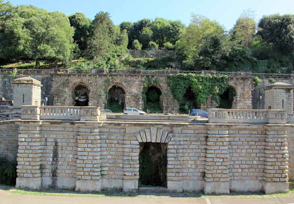 Il sistema delle Rampe si articola su tre livelli o ripiani: le Grotte, situate nei primi due ripiani delle Rampe, una sul primo e cinque sul secondo, che sono costituite da nicchie scavate nei due muraglioni a retta e sono realizzate con una struttura in muratura rivestita da intonaco lavorato e da spugne; la Grande Vasca polimaterica, situata sul terzo livello delle rampe, composta da più bacini, realizzata con una struttura in muratura rivestita da spugne, pietrame e mosaico; le Scogliere e le Piccole Grotte, posizionate lungo i percorsi, realizzate con blocchi di pietra provenienti dalle cave di Monte Ripaldi, come i ‘massi erranti’ disseminati in quei luoghi dove i percorsi si allargano.