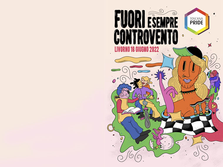 Fuori e sempre controvento è lo slogan della campagna di comunicazione del Toscana Pride 2022, la manifestazione dell’orgoglio LGBTQIA+* (lesbico, gay, bisessuale, transessuale, queer, intersessuale, asessuale). Un claim fortemente evocativo perché richiama la ricorrenza del cinquantesimo anniversario di un evento storico avvenuto a Sanremo il 5 aprile del 1972: la prima manifestazione italiana in difesa dei diritti e della dignità delle persone omosessuali, la protesta del F.U.O.R.I (Fronte Unitario Omosessuale Rivoluzionario Italiano) passata alla Storia come la Stonewall Italiana. FUORI però è il termine utilizzato anche per indicare il ritorno nelle strade e nelle piazze, dopo due anni difficili a causa della pandemia, in cui alla lotta LGBTQIA+* sono mancati i corpi favolosi e ribelli della comunità arcobaleno. Infine, nello slogan è forte il richiamo a Livorno attraverso il riferimento al vento.