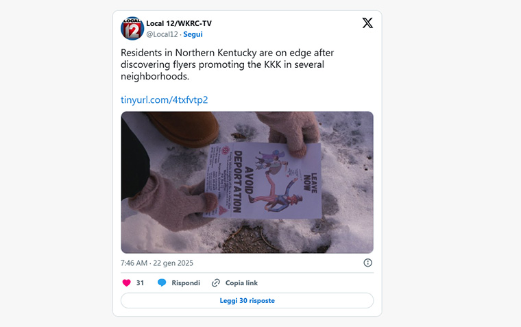 Volantini razzisti del Ku Klux Klan che invitano gli immigrati ad “andarsene subito” sono stati distribuiti in tutto lo stato del Kentucky non in un giorno qualsiasi, ma precisamente nel giorno del giuramento di Trump. La polizia ha aperto un’inchiesta. Lo scrive il britannico The Guardian.