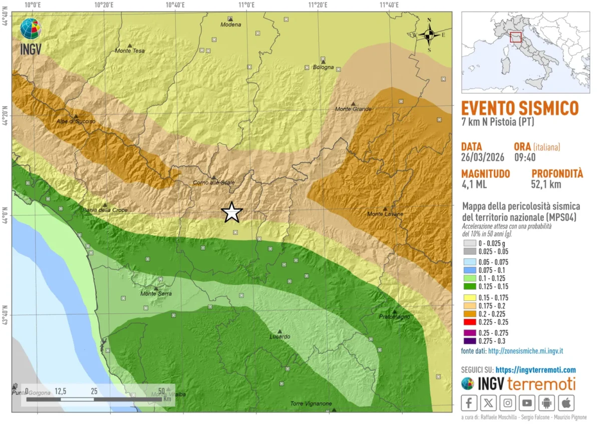 Nuova scossa di terremoto in Toscana che ha interessato stamattina Pistoia, con una magnitudo 4.1 ed epicentro localizzato a 7 km da Pistoia, a una profondità di 52 km. Il presidente Eugenio Giani rassicura che “sono stato subito contattato dalla sindaca facente funzione di Pistoia, Anna Maria Celesti, che ha confermato che non ci sono stati danni a persone o cose. Le verifiche sono in corso, l’allarme è rientrato e la situazione viene costantemente monitorata e tenuta sotto controllo dal sistema di Protezione civile regionale, anche perché si tratta del secondo terremoto in due giorni dopo quello di ieri a Fosdinovo in provincia di Massa Carrara”.