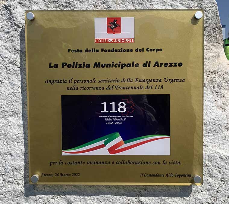 Una cerimonia significativa, quella che si è tenuta questa mattina alla centrale operativa del 118 presso l’Ospedale San Donato, e una festa particolare per i 171 anni dalla fondazione del Corpo della Polizia Municipale aretina, che ha voluto condividere questa momento con il personale sanitario del 118. A loro, e nel trentennale della loro attività, la PM ha voluto dedicare un cippo a testimonianza della continua e costante vicinanza e collaborazione, che ha consentito e consente di intervenire prontamente ed efficacemente nelle situazioni di emergenza ed urgenza. “Per trent’anni il 118 è stato il cuore pulsante della sanità di emergenza fuori dagli ospedali, e la risposta più immediata, insieme alla protezione civile, nei casi drammatici che purtroppo possono colpire le comunità: per questo, e per esprimere tutta la nostra gratitudine, abbiamo deciso di condividere con il personale dell’emergenza-urgenza questa nostra festa”, ha detto il comandante della Polizia Municipale Aldo Poponcini.